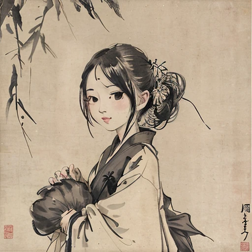 shukezouma, negative space, , shuimobysim , , portrait of a woman standing , willow branches, (masterpiece, best quality:1.2), traditional chinese ink painting, , modelshoot style, peaceful, (smile), looking at viewer, wearing long hanfu, hanfu, song, willow tree in background, wuchangshuo,